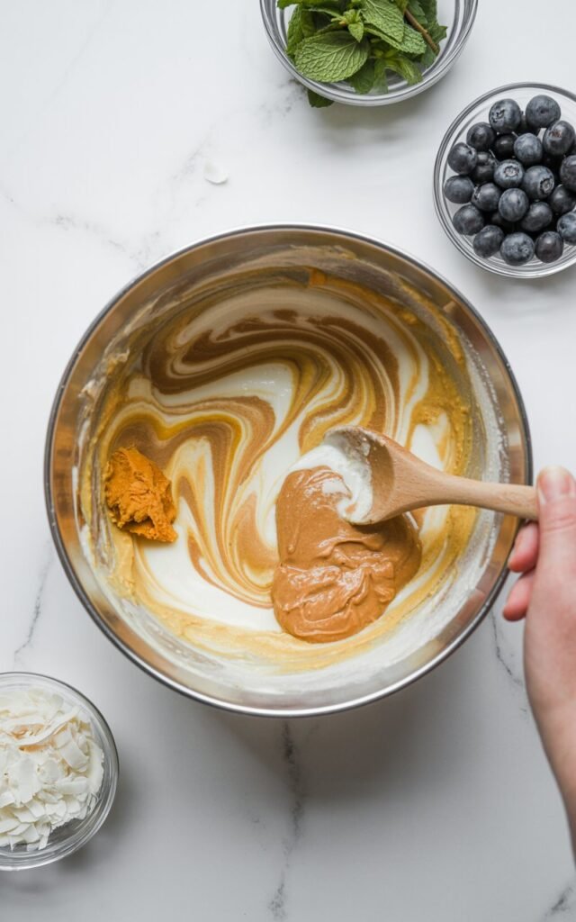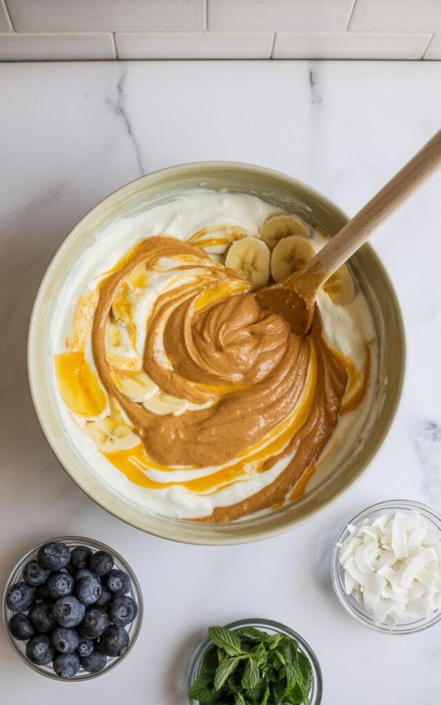 - Add the yogurt and peanut butter, mixing until fully combined.