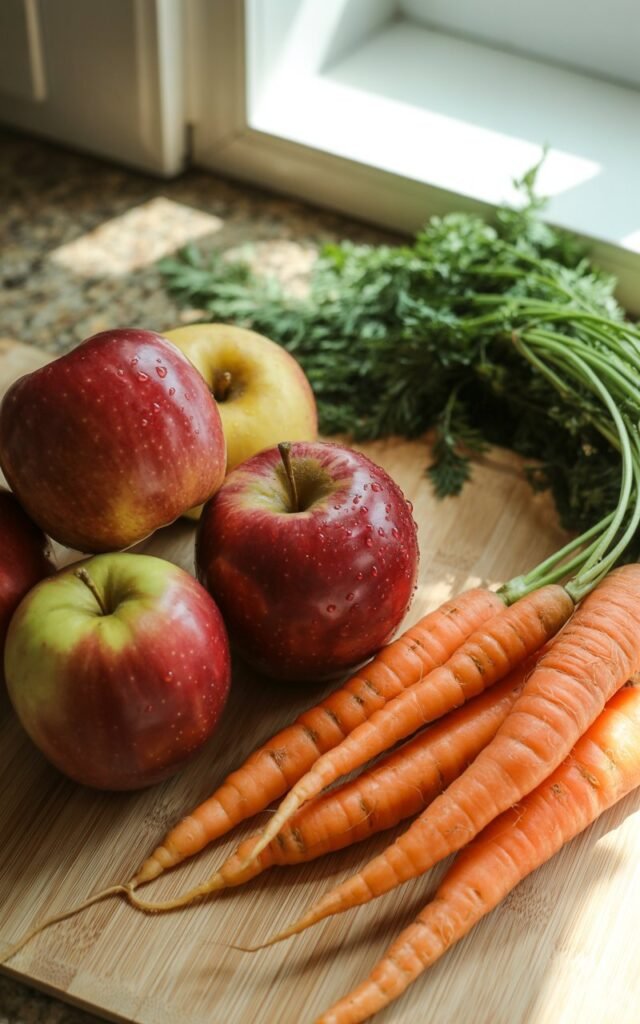 Apples give fiber and vitamins that support digestion and overall health, while carrots are packed with beta-carotene and help maintain healthy teeth.