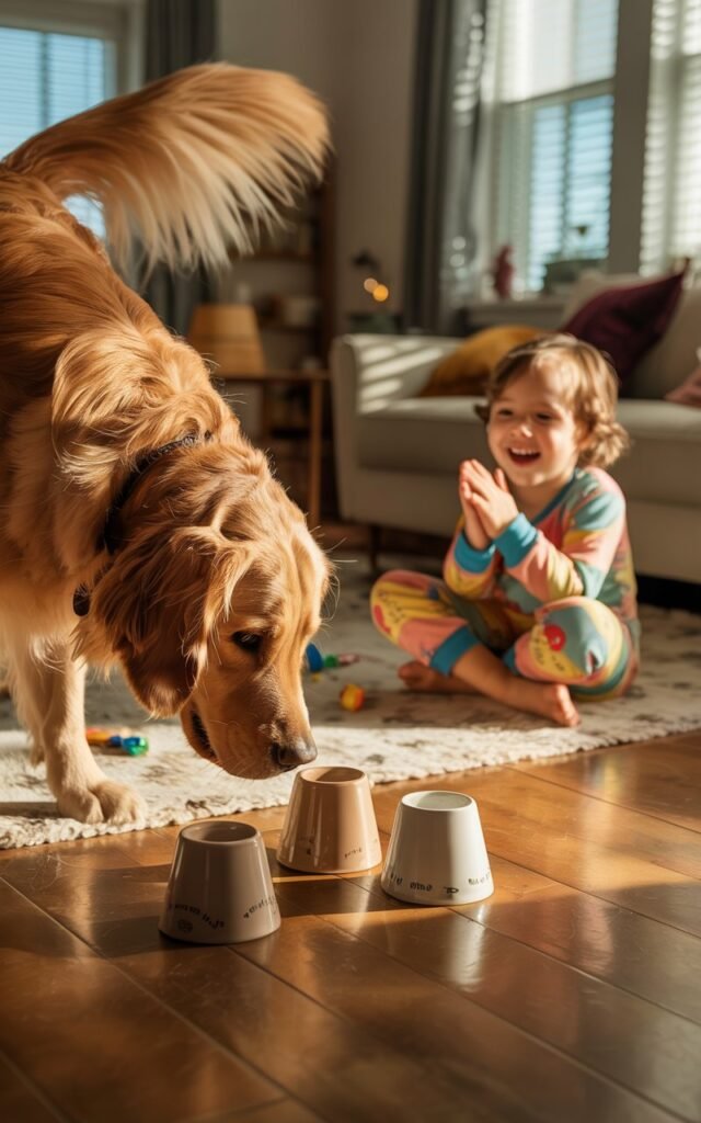 This game builds focus, memory, and problem-solving skills. Your dog has to pay attention, track movement, and make a choice.