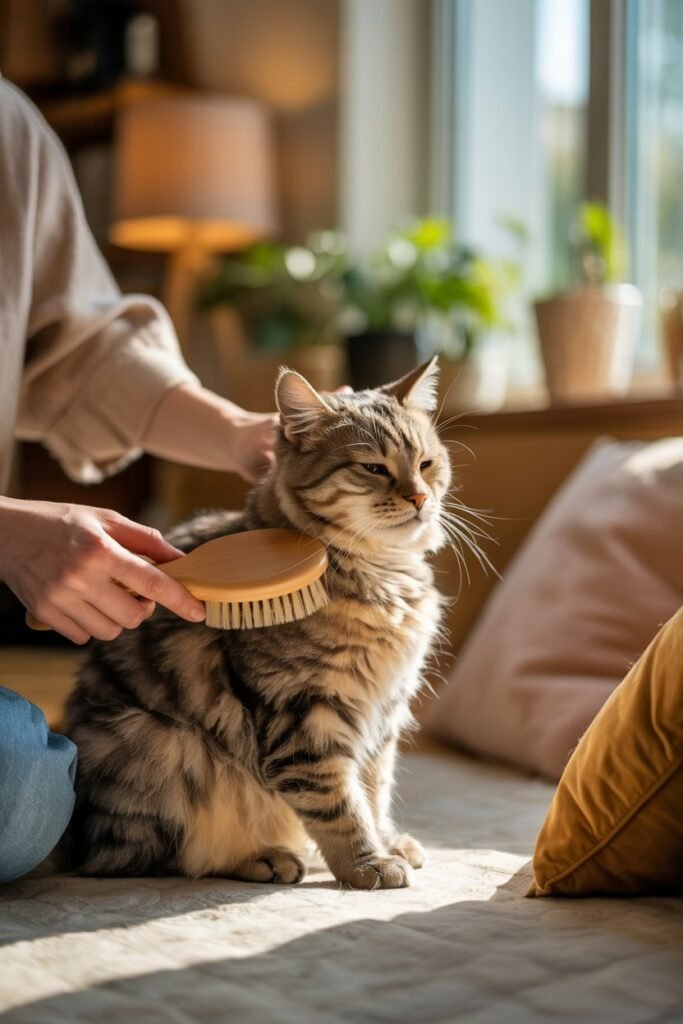 Regular brushing prevents mats, reduces hairballs, and gives me a chance to check for skin issues or parasites.