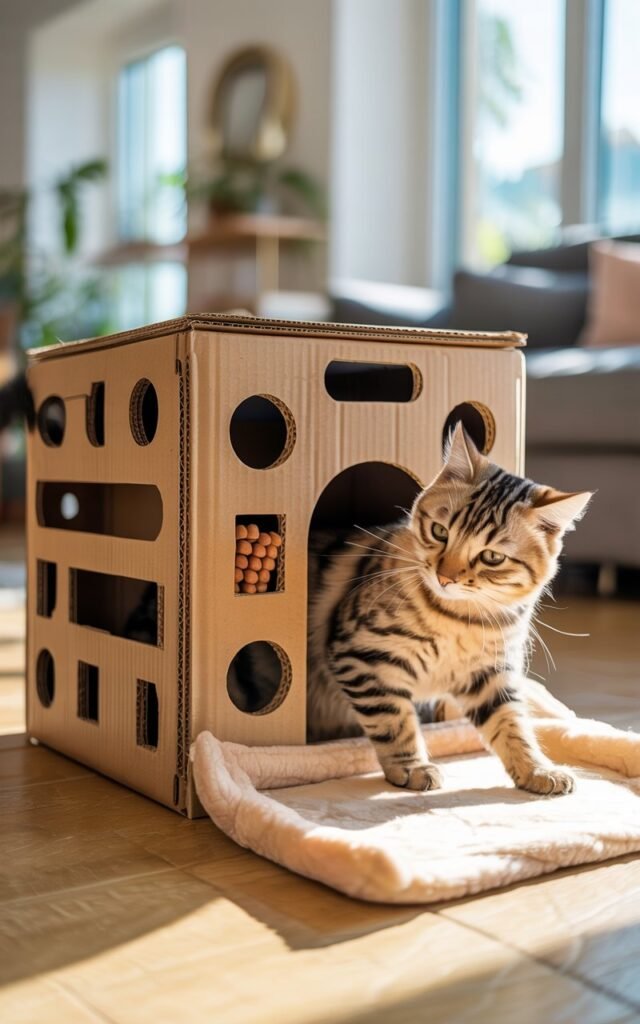 Cut flaps or holes in a box and hide treats inside. Your cat will paw, push, and problem-solve to reach the goodies.