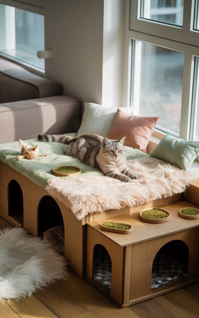 A cozy lounge is perfect for pampered kitties. Cut a low box and line it with soft fabric. Add catnip for extra joy.