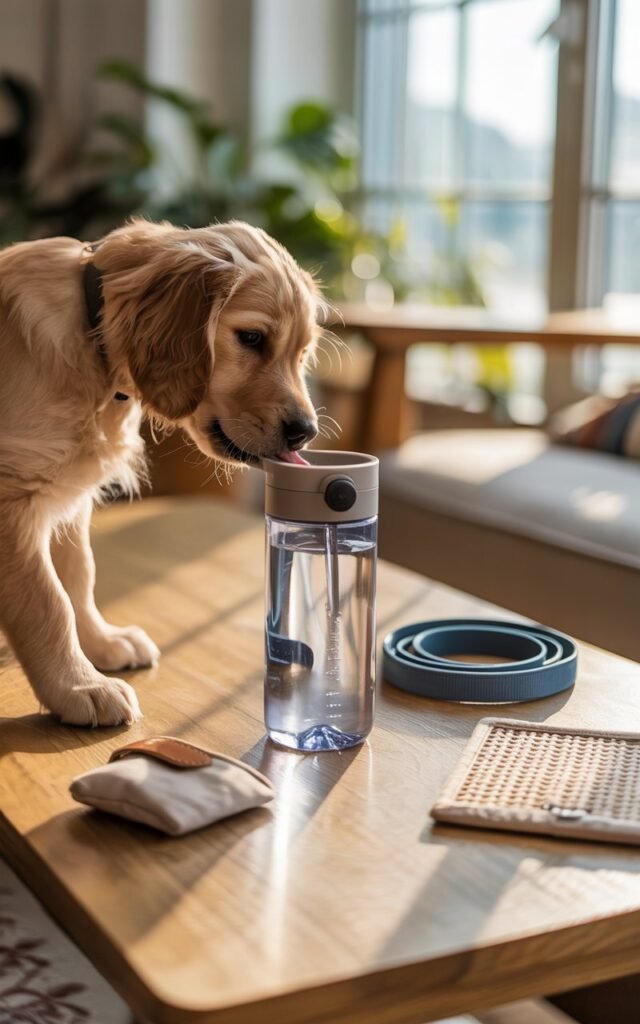 Hydration is crucial, especially on walks, hikes, or trips. I carry a portable dog water bottle that allows
