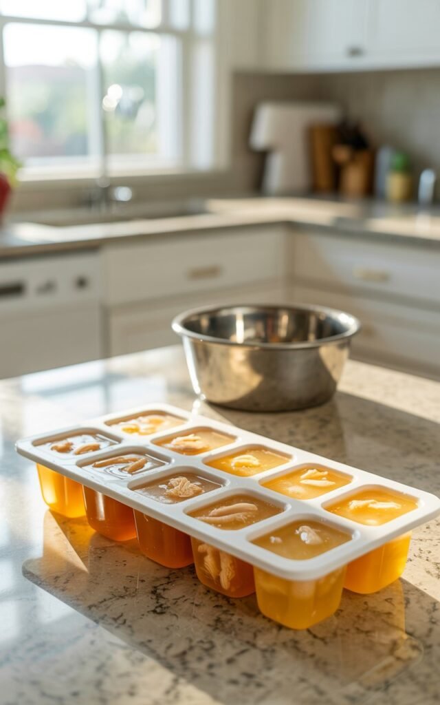 - Pour the chicken broth into ice cube trays.