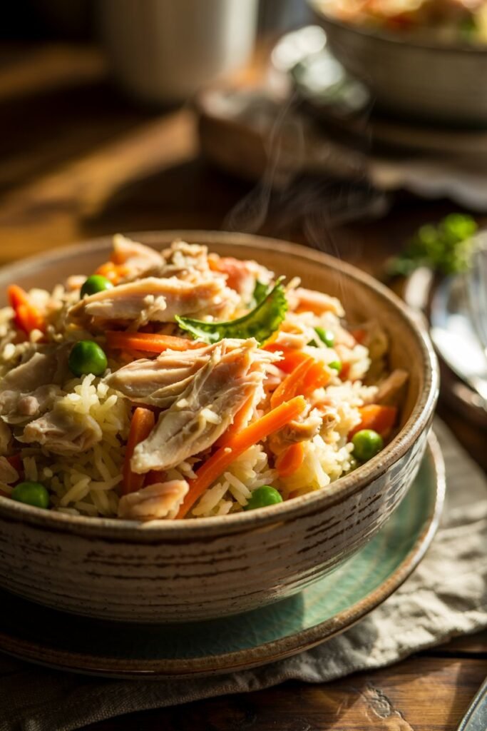- Combine the shredded chicken, rice, and veggies in one pan. Mix gently.