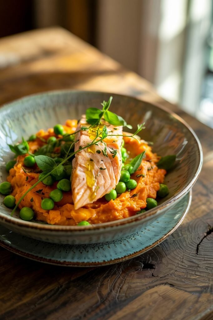 - Mix salmon, mashed sweet potato, peas, and olive oil in a bowl.