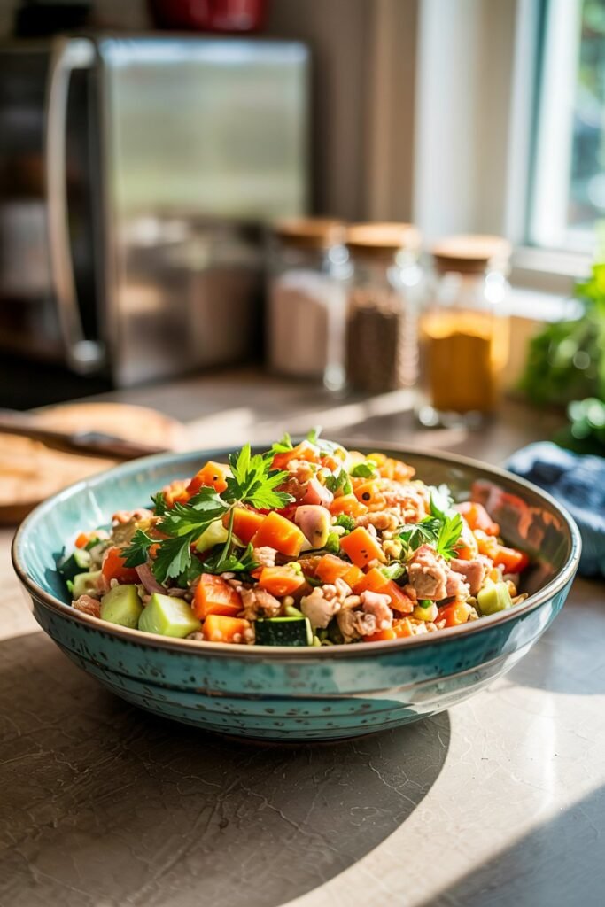 - Combine turkey, vegetables, and quinoa/rice in a bowl. Mix well.