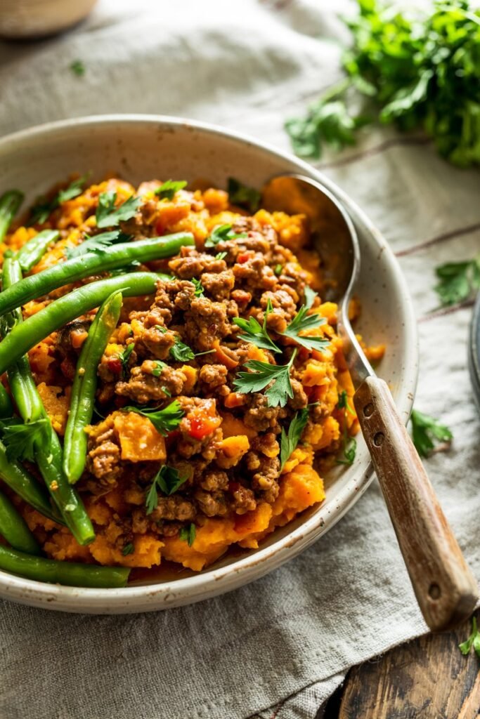 - Mix the beef, sweet potato, and green beans together in a bowl or pan.