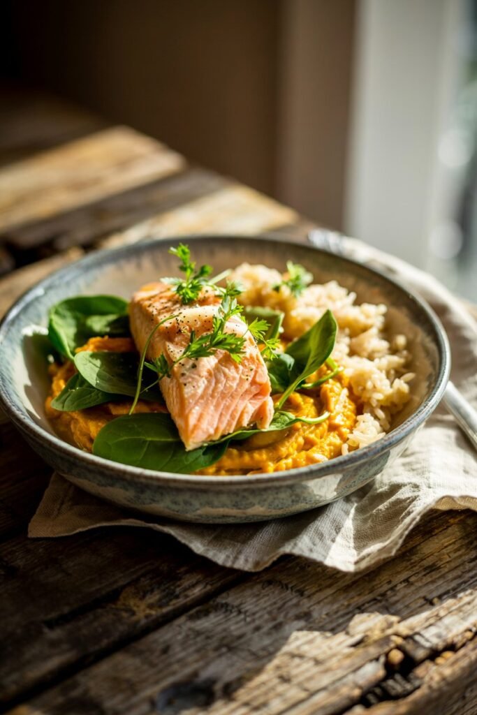 - Combine salmon, pumpkin, rice, and spinach in a bowl. Mix gently.