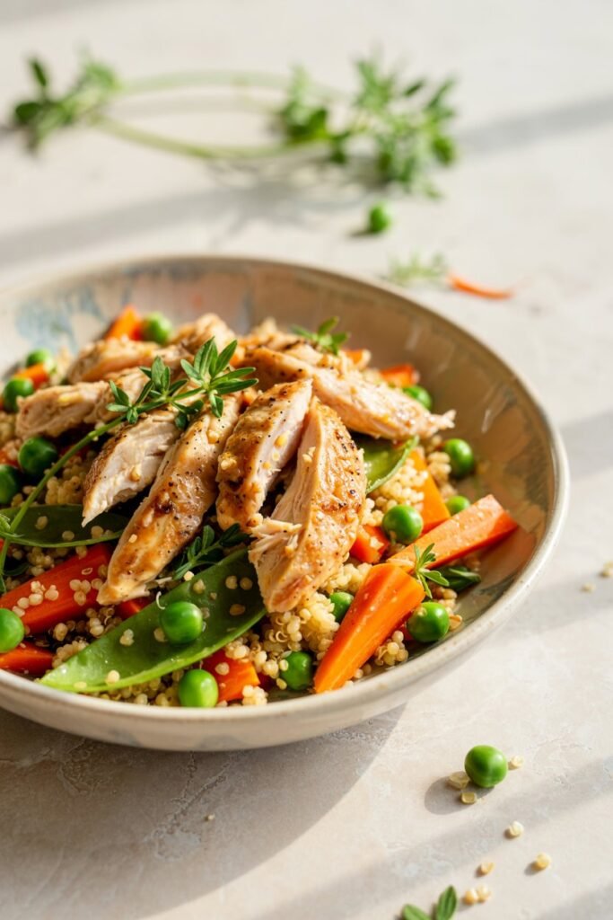 - Mix chicken, quinoa, and vegetables in a bowl.